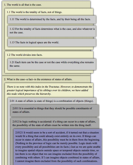 The decimal figures as numbers of the separate propositions indicate the logical importance of the propositions, the emphasis laid upon them in my exposition. The propositions n.1, n.2, n.3, etc., are comments on proposition N° n; the propositions n.m1, n.m2, etc., are comments on the proposition N° n.m; and so on. [N.d.W]